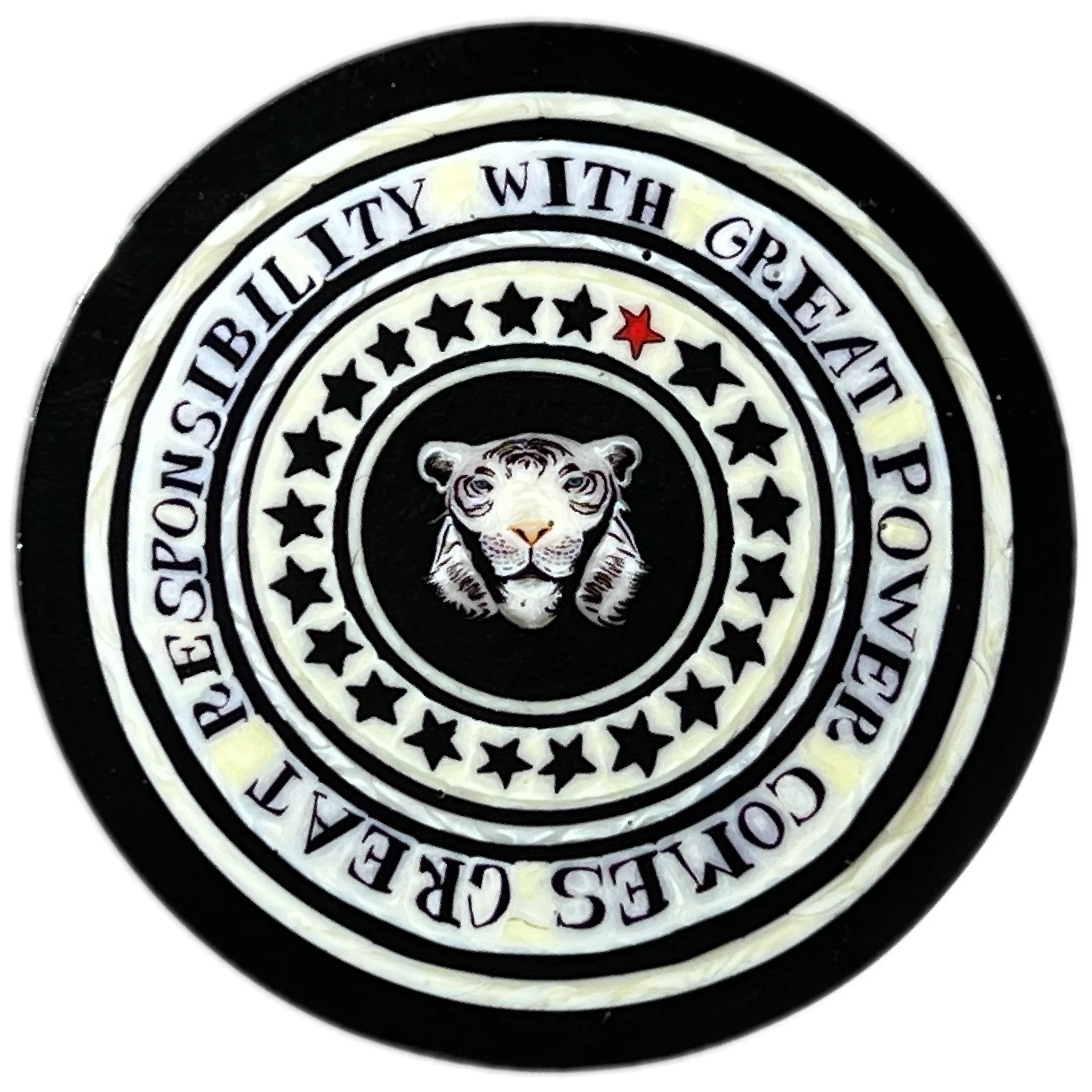 Casati, a quote from the Marchesa is contained in a rectangular shape, a square holds a signature with year, and the fourth is a star. The openings have a yellow band. The quote reads, “I see myself. I feel as if I am a lion.”